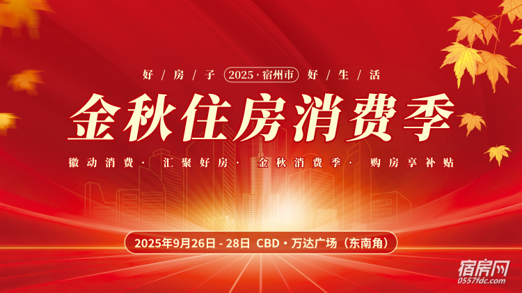 徽动消费,惠聚好房。由宿州市房产管理服务中心主办,宿州市房地产业协会、宿州市银行业协会承办的2025宿州“好房子·好生活”金秋住房消费季,将于9月26日至28日在宿州CBD万达广场隆重举行。本次消费季旨在加快构建房地产发展新模式,推进好房子建设,加大优惠促销力度,更好满足人民群众对美好生活的需求,实现更高水平的住有所居。