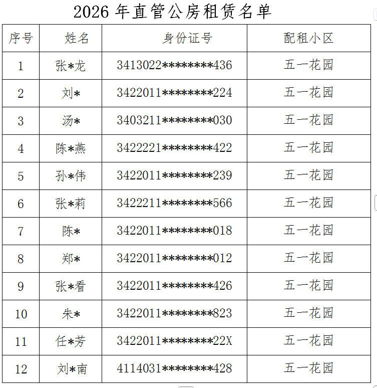 据2026年1月13日《宿州市直管公房住宅房公开招租公告》,公开招租五一花园12套公房住宅房毛坯房(6幢2204室70.34平方米1套、1幢501室125.70平方米1套、1幢401室125.70平方米1套、1幢301室125.70平方米1套、1幢405室125.70平方米1套、1幢305室125.70平方米1套、5幢404室126.39平方米1套、7幢203室114.58平方米1套、4幢1301室128.20平方米1套、4幢1201室128.20平方米1套、4幢1401室128.20室1套、4幢805室128.20平方米1套)。经审核符合招租条件的,现向社会公示(名单附后),公示期5个工作日2026年1月28日至2月3日止。