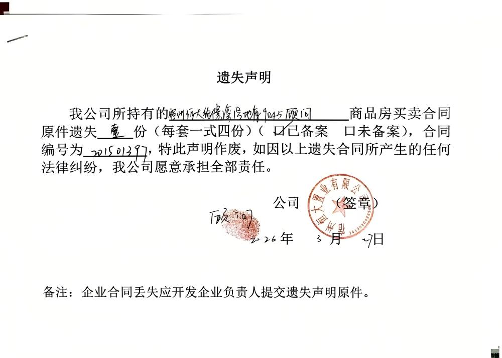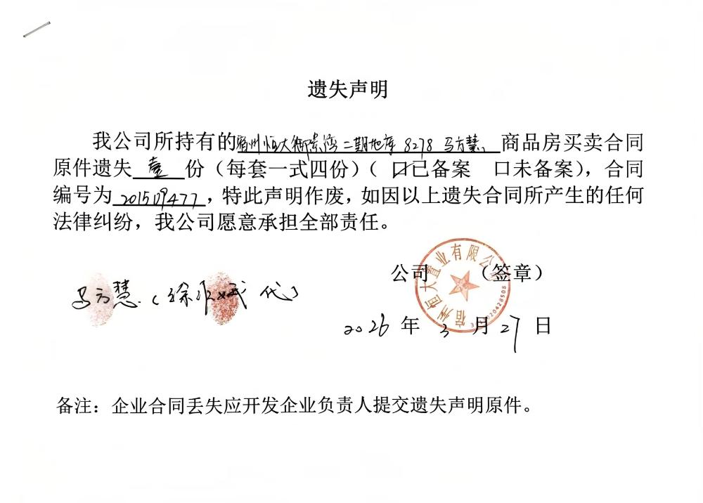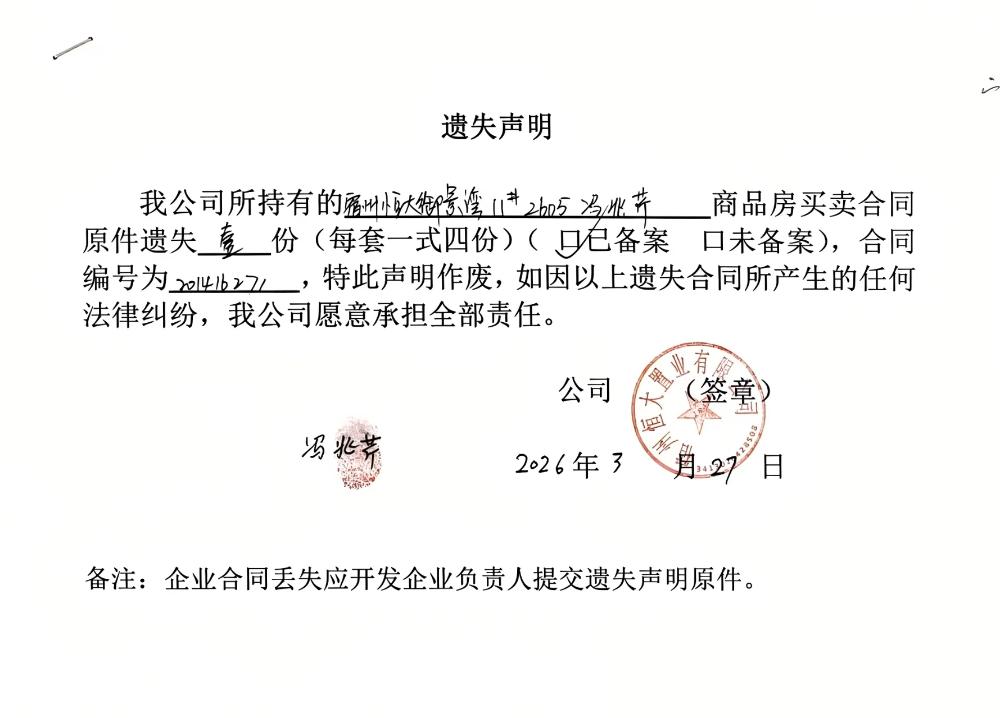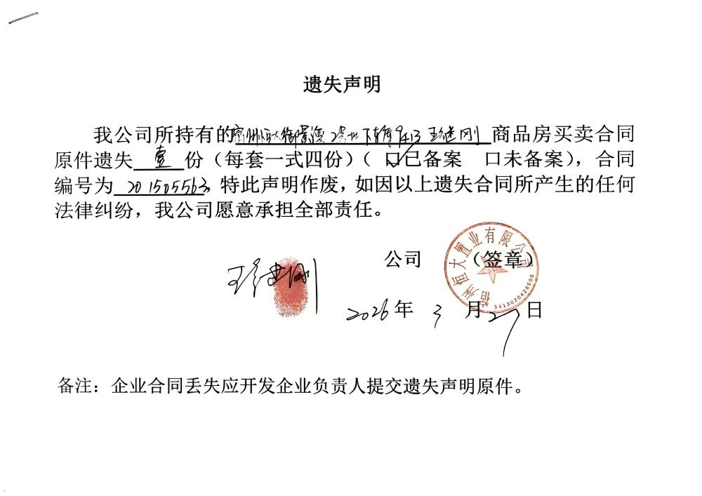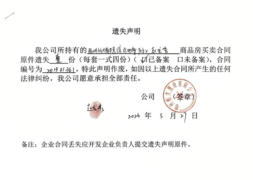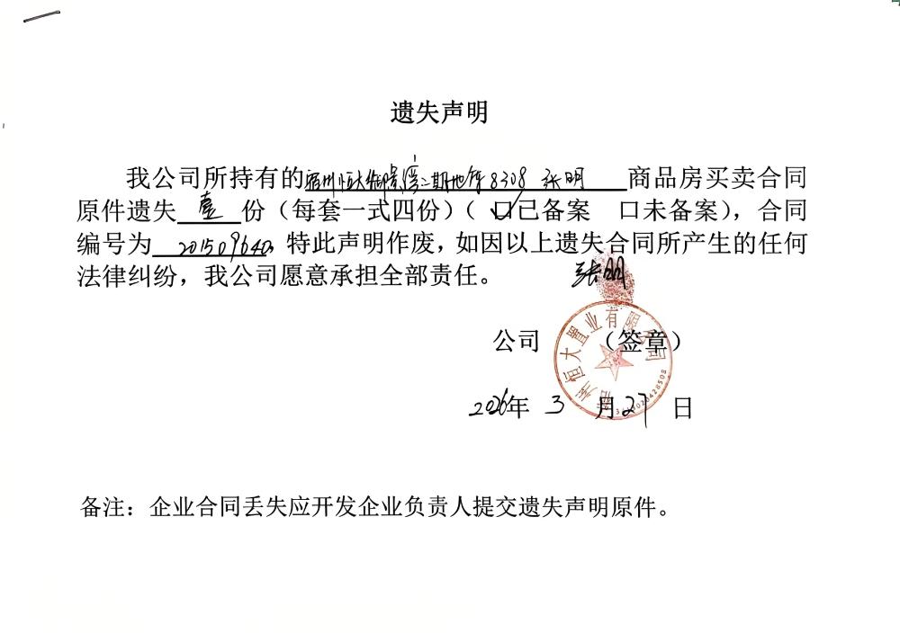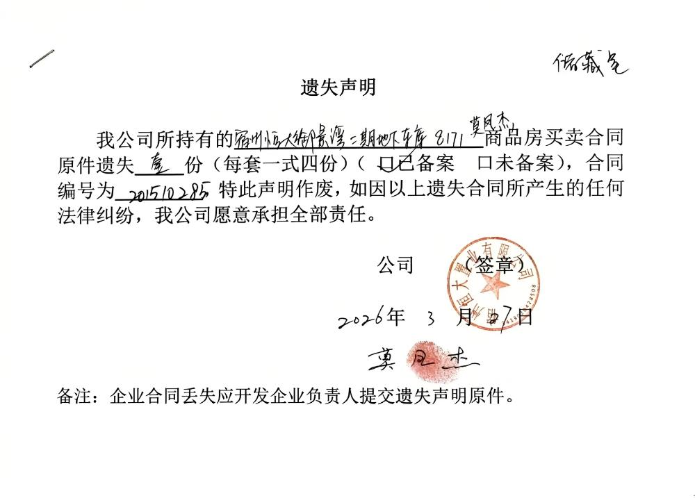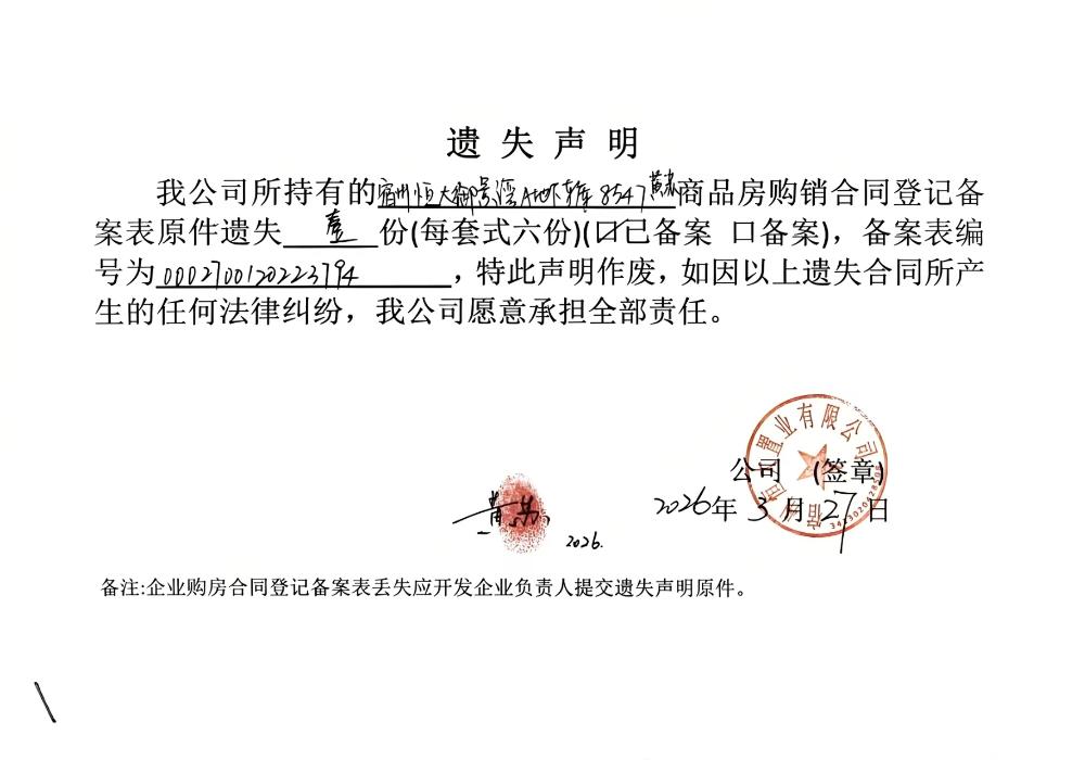 宿州恒大御景湾合同遗失公告