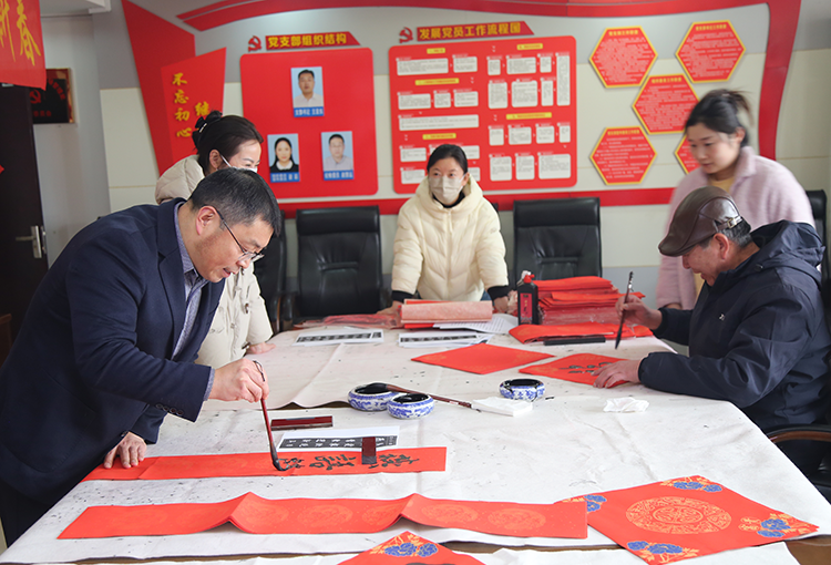 活动现场暖意融融、墨香萦绕,大红宣纸整齐铺展,活动特邀安徽省书法家协会会员,中心退休职工张宏桥现场书写春联,为党员、职工们送去新年祝福。
